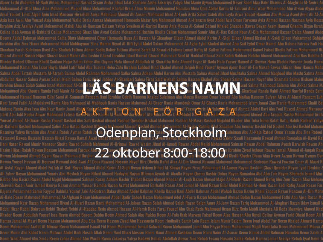 Förra året samlades vi för att läsa namnen på de barn som dödats i Palestina och Israel sedan 7 oktober 2023. Sedan dess har tusentals fler barn dödats i Gaza. Vi samlas i år igen för att läsa barnens namn och kräva att Sverige ska agera för att civila ska skyddas och att våldet stoppas nu – inte ett liv till!