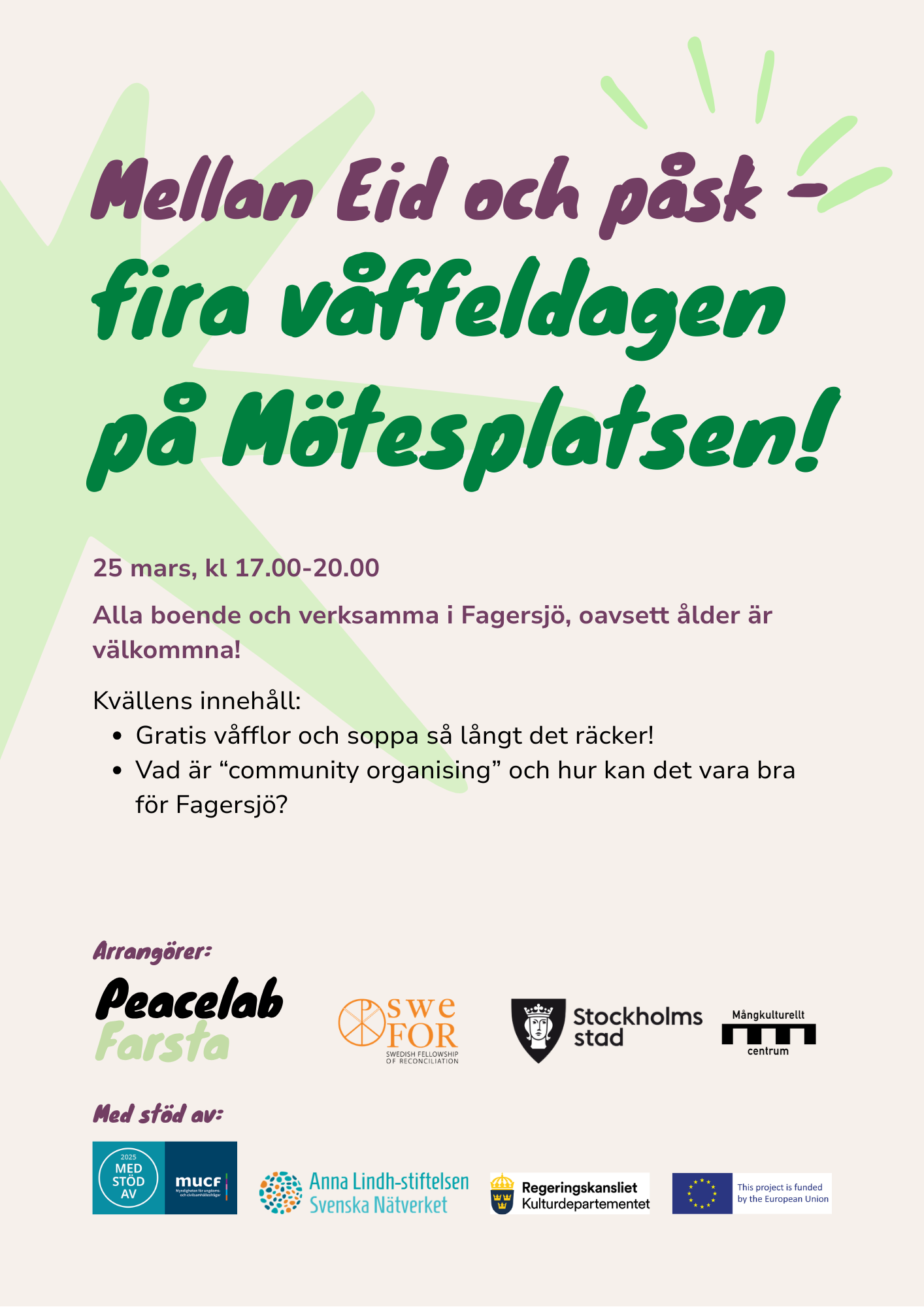 Inom ramen för vårt projekt Peacelab Farsta arrangerar vi den 25 mars en träff för boende och verksamma i Fagersjö, Farsta i syfte att stärka lokal sammanhållning och kunna bidra till att öka tryggheten i området.