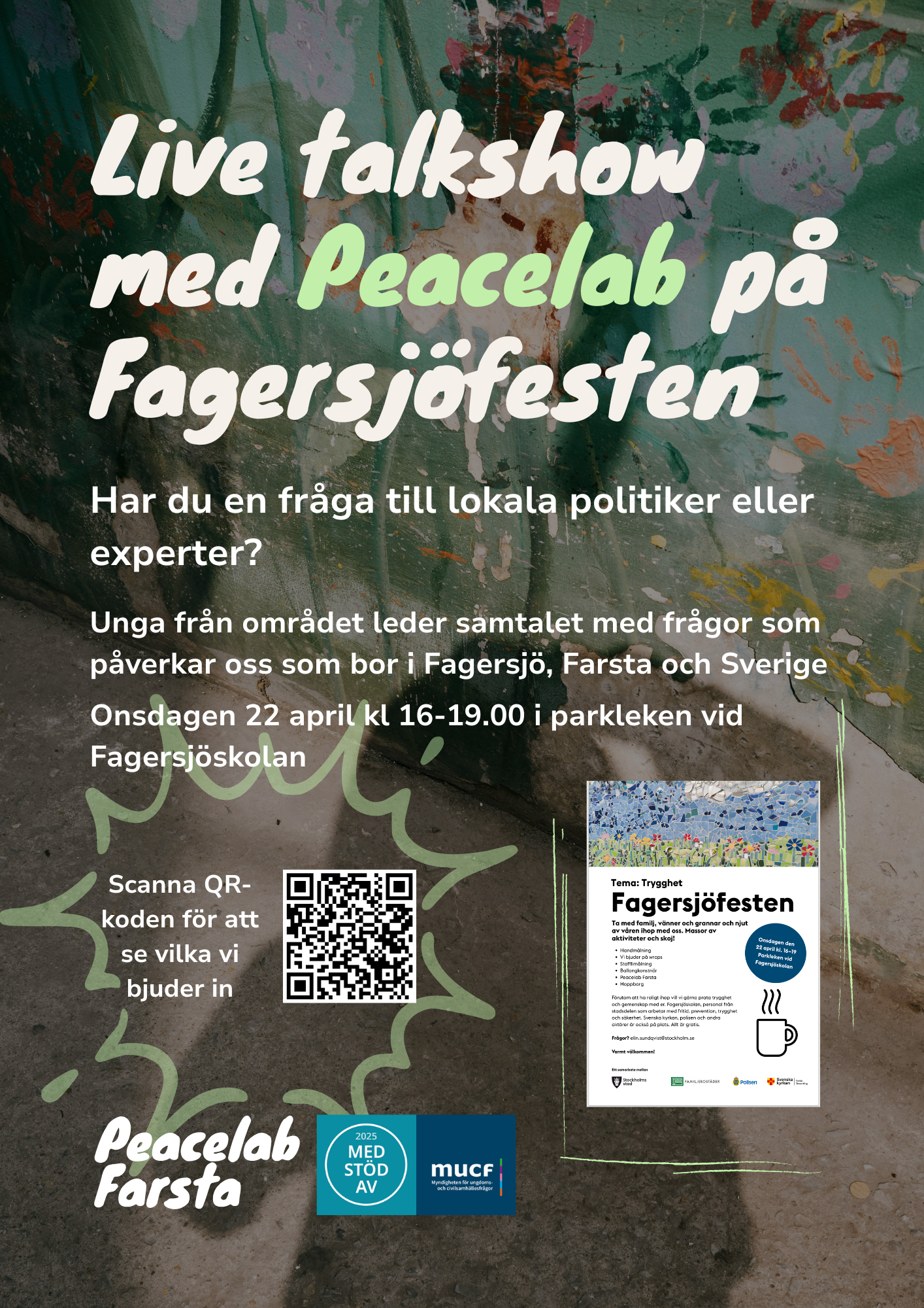 Den 22 april medverkar Peacelab på Fagersjöfesten med tema "trygghet", i Farsta, Stockholm. Peacelab producerar och genomför en live talkshow med inbjudna gäster för att stärka det offentliga samtalet och ungas delaktighet i lokalområdet.