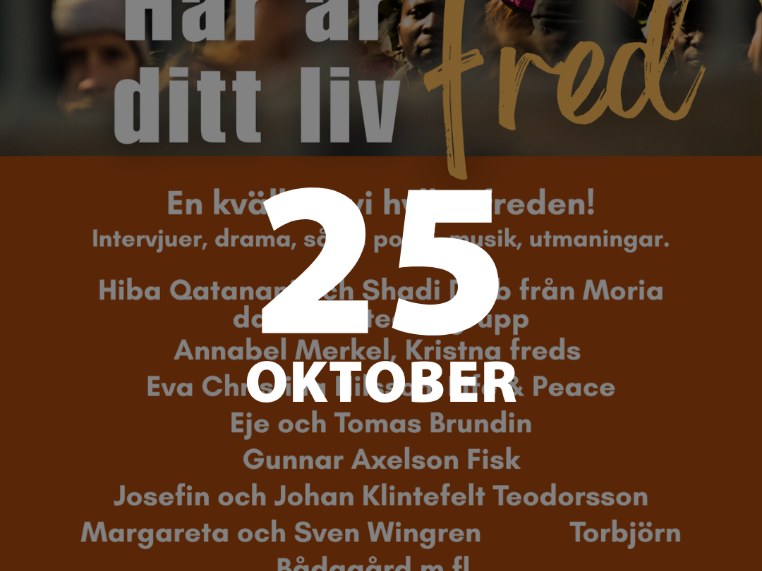 Välkommen till en hyllningskväll till freden i Uppsala Missionskyrka lördagen den 25 oktober. Här är ditt liv - Fred är en kväll fylld med intressanta samtal, drama, sång, poesi och musik som arrangeras av Equmeniakyrkan och Studieförbundet Bilda. Kom och träffa bland andra Kristna Fredsrörelsens styrelseledamot Annabel Merkel.